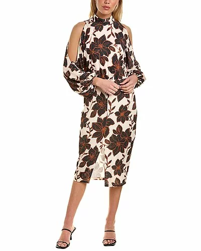 - 3/4-Sleeve Sheath Dress in black white floral with mock neck, cold-shoulder balloon sleeves, front slit at hem, and open back