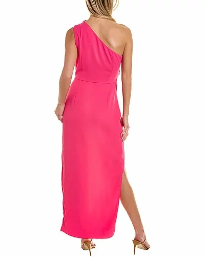 - Alessi Maxi Dress in hot pink with one-shoulder style, gathered detailing and split skirt front