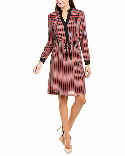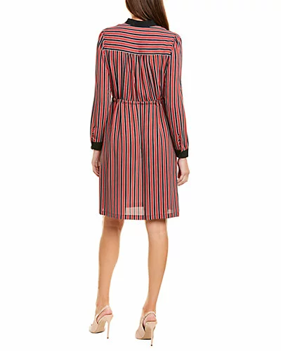- Carlyle Stripe Shirtdress in cinnamonne black combo with split neckline, barrel cuffs and drawstring waist
