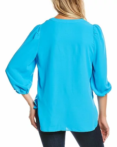 - Split Neck Blouse in tropical blue with V-neck, shirred shoulders, 3/4-length sleeves, elasticized cuffs, and high-low hem
