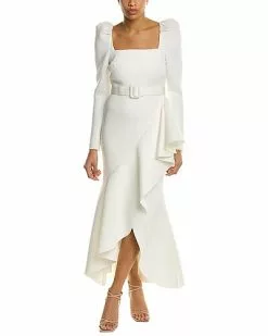 - Draped Flounce Day Dress in ivory with square neckline, pleated shoulders, ruffle cascade at skirt, belted waist, and high-low hem