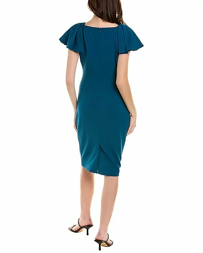 - Midi Sheath Dress in peacock with boat neck, flutter sleeves, and vent at back
