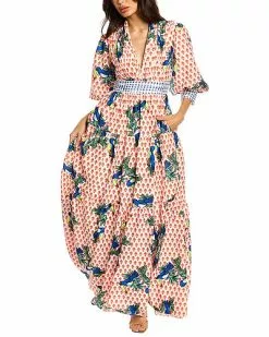 - Tucan Gown in red multi with high neck, plunge V, 3/4-length puff sleeves, pintuck accents, and dual side slip pockets