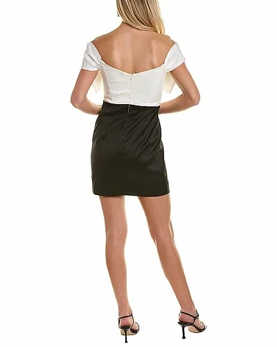 - Design details: off-the-shoulder style, oversized bow bodice, and contrast skirt