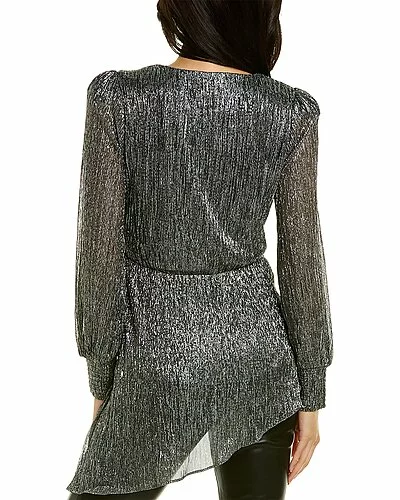 - Metallic Peplum Top in gunmetal with pleated metallic fabric, surplice neckline with hook-and-eye closure, shirred shoulders, smocked cuffs and layered asymmetrical peplum hem