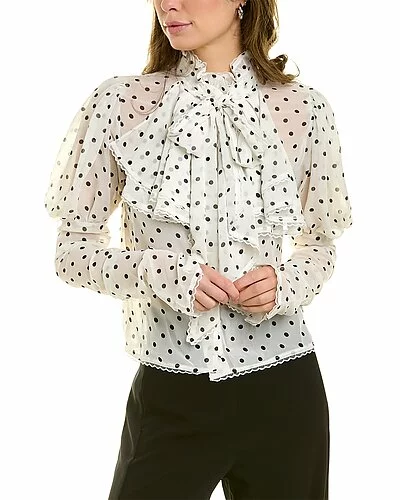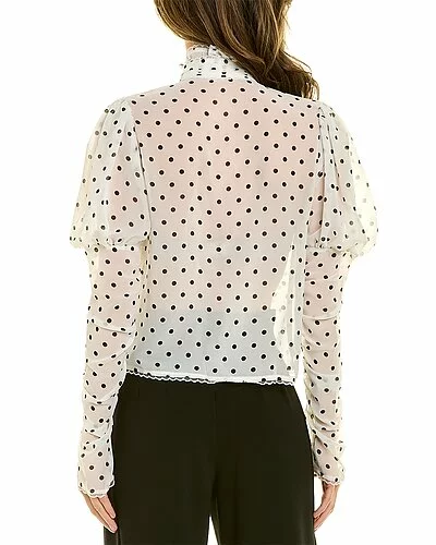 - Polka Dot Blouse in white with semi-sheer fabric, self-tie neck sash, ruffle detailing, lace trim, draped puff shoulders and ruched sleeves