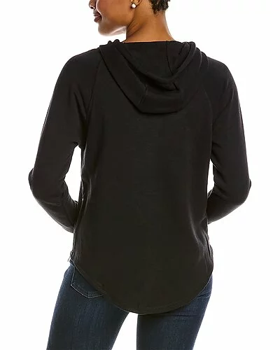 - Slub French Terry Zip Hoodie in true black with drawstring hood, raglan sleeves, kangaroo pocket and shirttail hem with zippered side slits