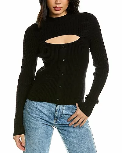 - Cutout Sweater in black with mixed knit, cutout neckline and faux button front