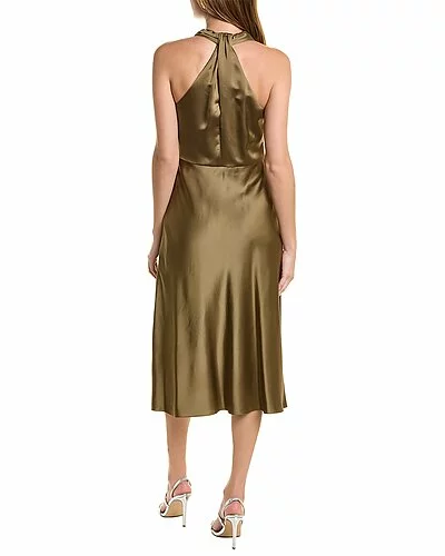 - Halter Dress in moss with cowl neck, A-line skirt, and twist detail at back