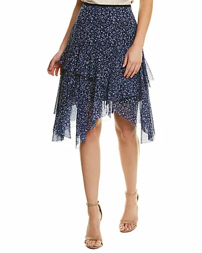 - Sharon Silk Midi Skirt in regal multicolor with floral chiffon design and handkerchief hem