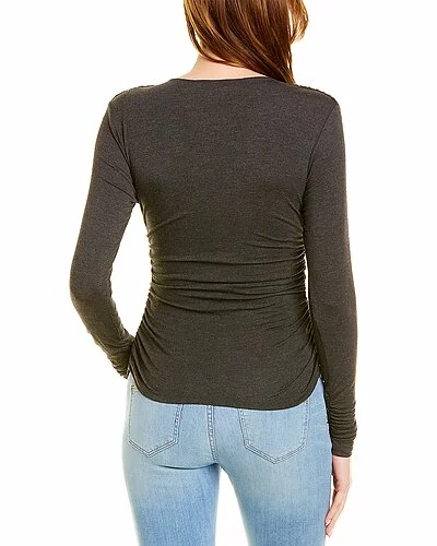 - Layered Wrap Top in charcoal heather with V-neck, twisted front and shirring details