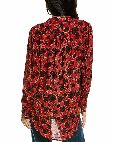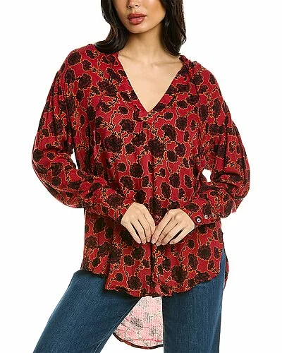- Mia Tunic in red with jacquard design, button cuffs, and shirttail hem