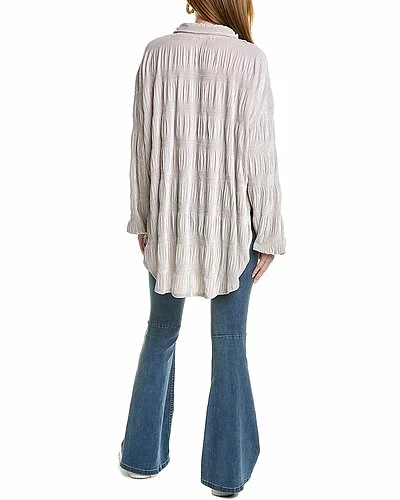 - My Best Top in winter fog with smocked velvet construction, spread collar, elasticized cuffs and curved high-low hem