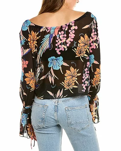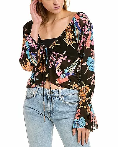 - Of Paradise Top in black combo with plunging neckline, bell-sleeves, and tie front