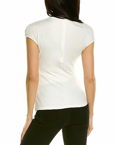- Lace Front Blouse in white with mock neck, scallop hem, and cap sleeves