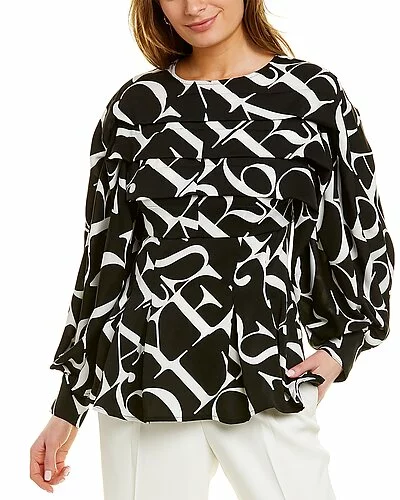 - Number Print Peplum Blouse in black with pintuck pleated detailing, oversized sleeves, and high-low hem