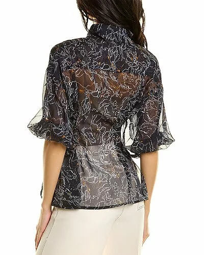 - Puff Sleeve Sheer Top in navy with elbow-length sleeves