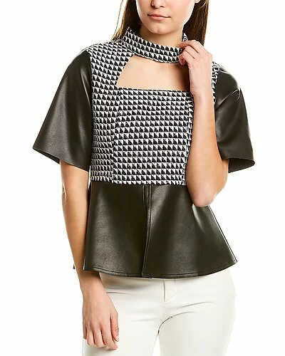 - Two-Tone Top in black with faux leather panels, peplum hem, and choker collar
