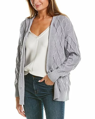 - Sunday Hooded Cashmere-Blend Cardigan in grey with cable-knit design, dropped-shoulder sleeves, ribbed trim, and two front pockets