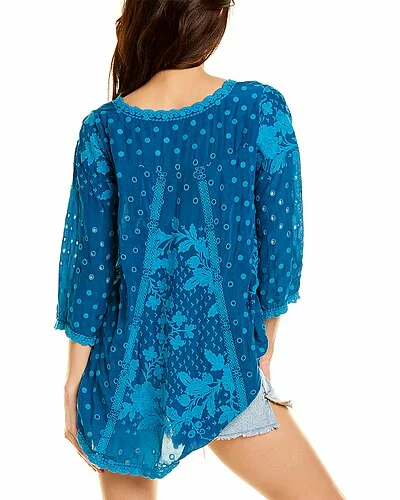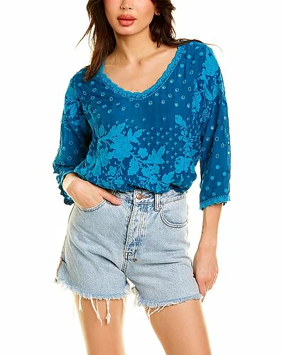 - Melby Kenzie Top in cerulean with scoop neck, 3/4-length sleeves, and embroidered eyelet design