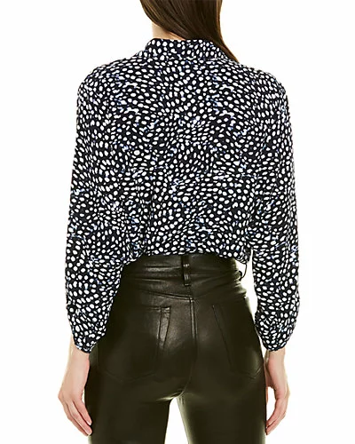 - Design details: crepe fabric, spread collar, dolman sleeves with roll-up tabs, curved hem