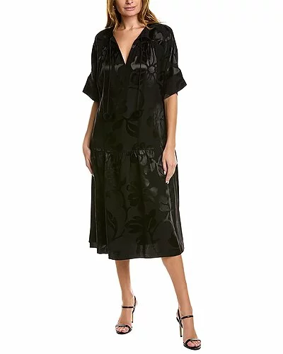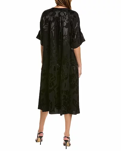- Silk-Blend Shift Dress in black with floral jacquard print, dolman sleeves, dual side on-seam pockets, and shirred skirt