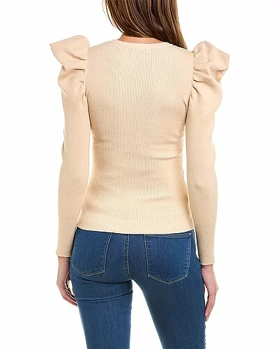 - Puff Sleeve Top in beige with ribbed knit design and puffed shoulders