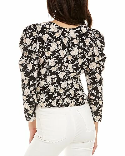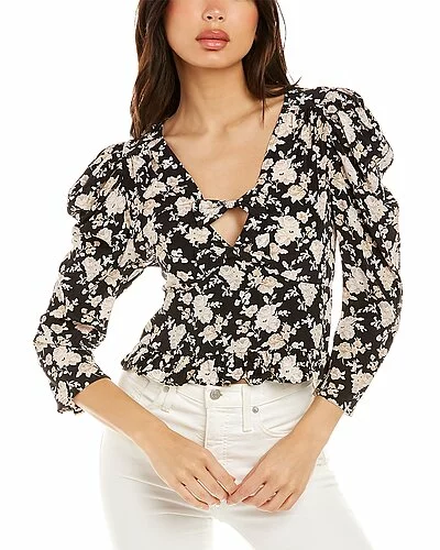 - Louis Silk Blouse in almond cookie with puff sleeves, shirred shoulders, keyhole cutout, bow accents, and ruffle hem