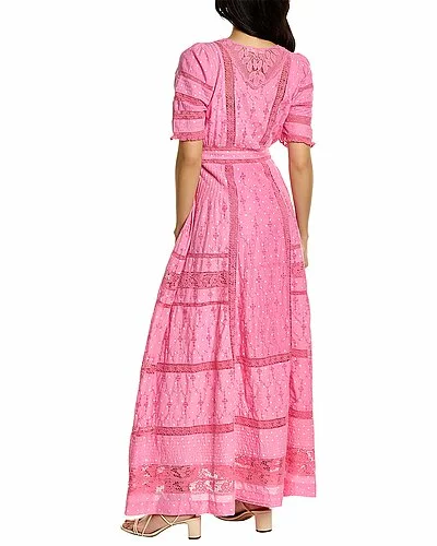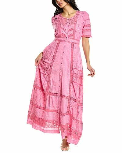 - Victorian Maxi Dress in pink polka dot with crochet design and 3/4-length sleeves