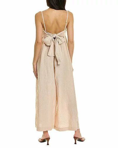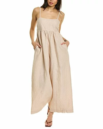 - Eugenie Linen-Blend Jumpsuit in earthen clay with shirred empire waist and dual side on-seam pockets
