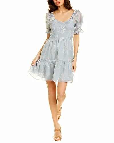- Lucie Silk Mini Dress in dusty pool with smocked bodice, elasticized ruffle cuffs, tiered skirt and dual side seam pockets