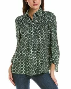 - 3/4-Sleeve Top in emerald & sage four leaf clover with spread collar, shirred shoulders, 3/4-length blouson sleeves, and elasticized cuffs