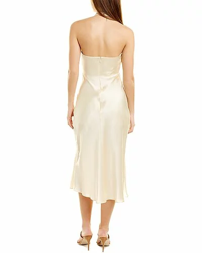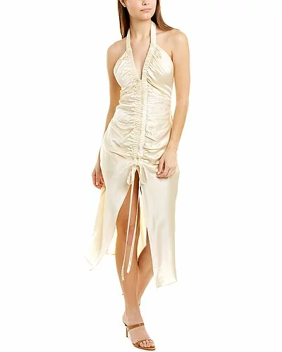 - Design details: elasticized halter neckline, ruched front with drawstring ribbon detail and split front hem