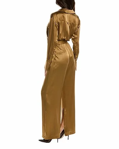 - Design details: satin design, dual chest pockets, elasticized waistband, two front pockets, button cuffs, slits at hem