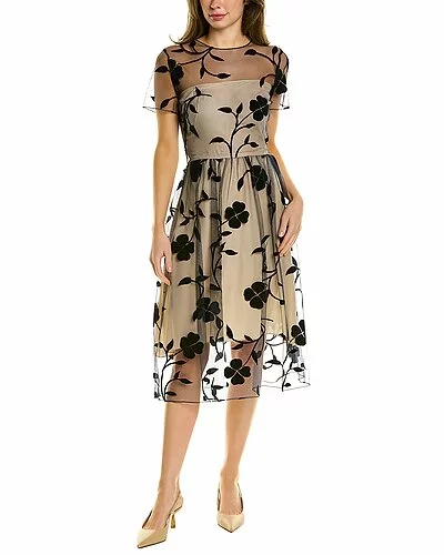 - Floral Silk-Lined Cocktail Dress in black with nude slip, cap sleeves, and A-line skirt