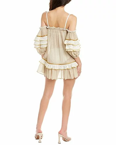 - Kyro Mini Dress in neutral with elasticized strapless style, off-the-shoulder puffed sleeves, macrame and glitter ribbon trim, and tiered ruffle hem