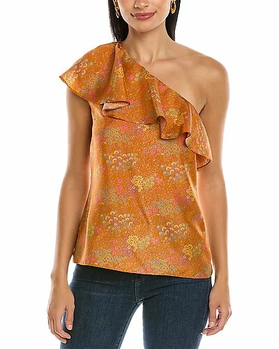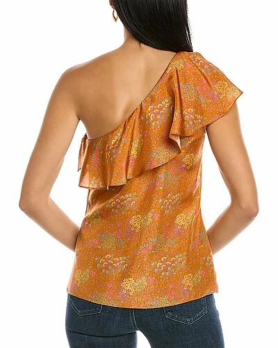 - Isabelle Silk Top in burnt orange with one-shoulder design and cascading ruffle trim