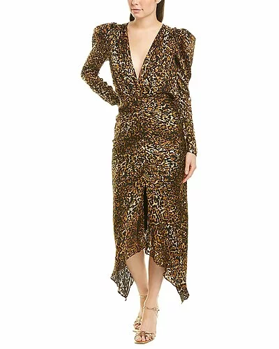 - Design details: plunge neck, ruched front, shirred shoulders, sharkbite hem with vented front