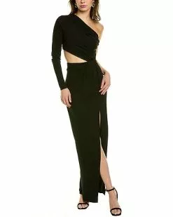- Lorinna Dress in black with one-shoulder style, cutout waist, ruched drape waistband, and slit skirt