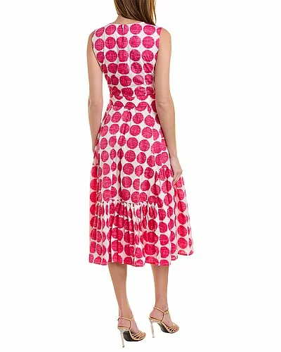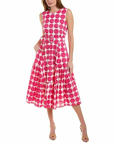 - Amanda Midi Dress in fuzzy dot bubble pink with side seam pockets, matching belt, and tie sash at waist