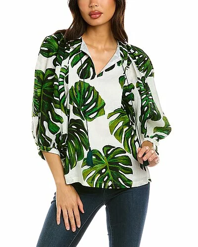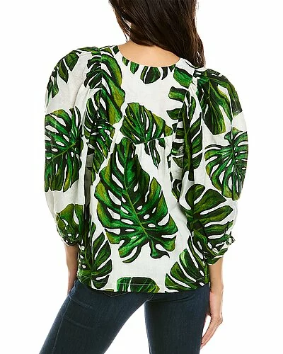 - Anastasia Top in white green monstera leaves with blouson dolman sleeves and button cuffs