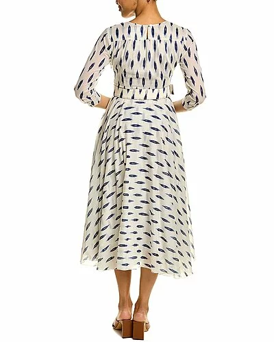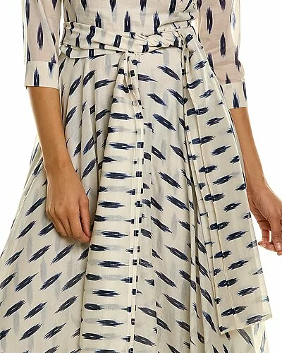 - Aster Shirtdress in abstract b ivory indigo with 3/4-length sleeves, side seam pockets, removable belt, and tie sash