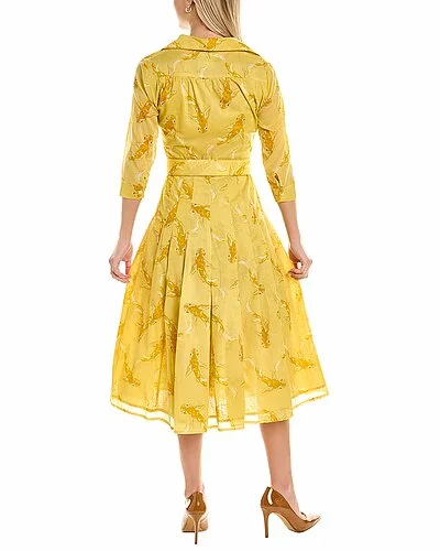 - Patricia Shirtdress in trout schubert soft yellow with spread collar, button cuffs, belted waist, pleated skirt and dual side seam pockets