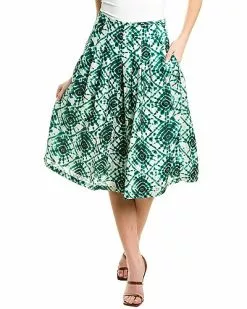 - Zelda Midi Skirt in shibori swirl white jade with pleated design and two front pockets