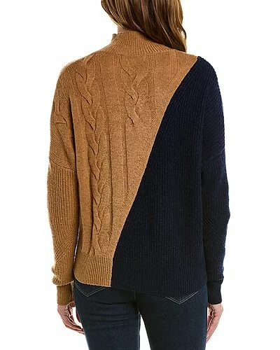 - Colorblock Wool & Cashmere-Blend Sweater in brown and navy with turtleneck and dropped-shoulder dolman sleeves