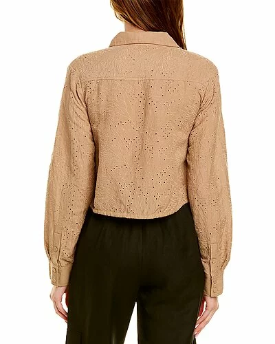 - The Harlow Linen-Blend Top in broderie anglaise with spread collar, embroidered design, eyelet detailing, button cuffs and cropped drawstring hem