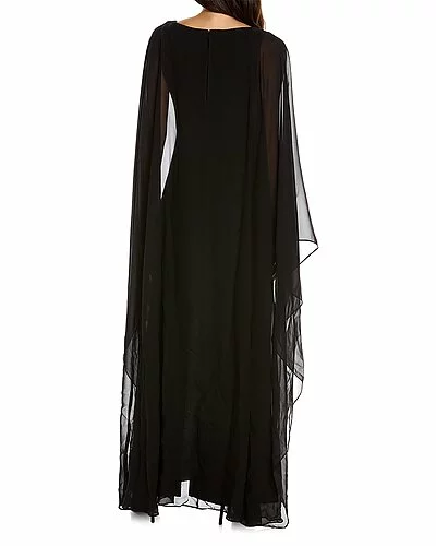 - Sculpted Wool-Blend Gown in caviar with cape shoulders and vented back hem