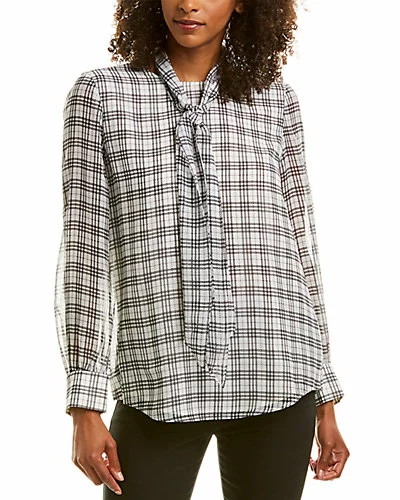 - Silk Blouse in caviar and black plaid with barrel cuffs, shirttail hem, and scarf detail