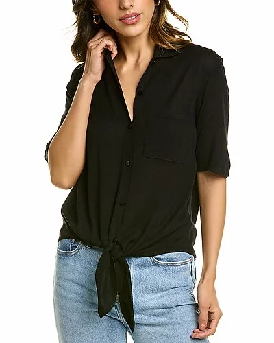 - Hekanina Silk-Blend Top in black with spread collar, left chest pocket, and self-tie front hem