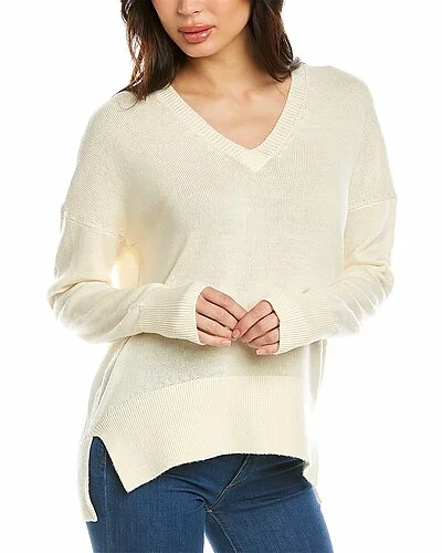 - Karenia Sweater in ivory with V-neck, dropped-shoulder sleeves and ribbed trim